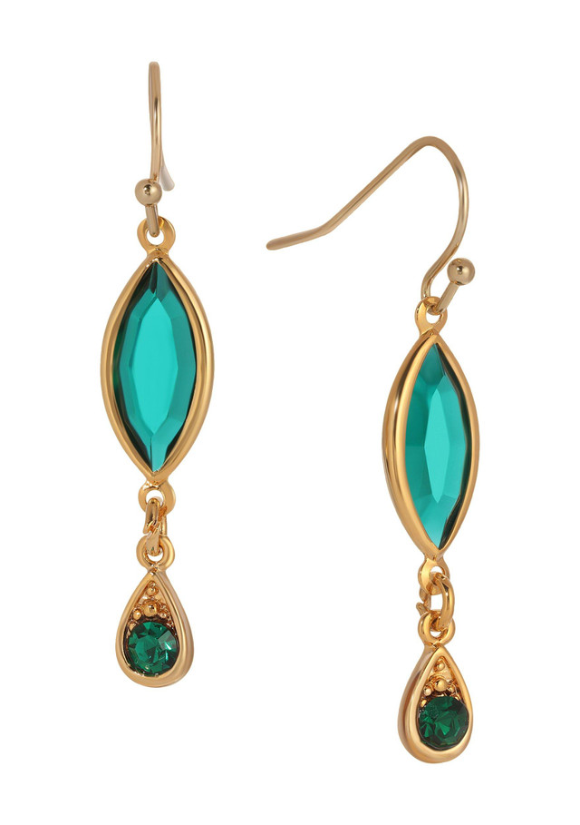 These elegant dangling earrings feature a stunning combination of navette and round emerald green stones, arranged to catch the light with every movement. Suspended from classic fish hook backings, they offer a touch of sophistication and vibrant color to any outfit. Perfect for adding a pop of color and elegance, these earrings are a must-have accessory for any jewelry collection. Length 1.55 in., width 8mm.