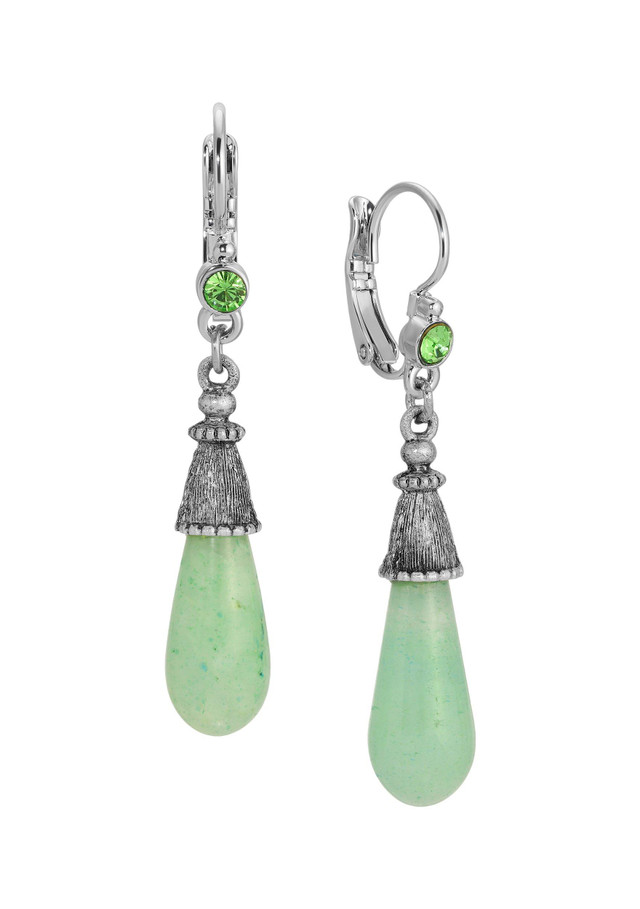 Sparkling peridot crystals catch the light beautifully, leading to a dangling teardrop green aventurine gemstone that radiates natural charm. Set in a light antiqued finish, these earrings offer a vintage-inspired allure with a modern twist. The secure lever back design ensures comfort and style for any occasion. Delicate and feminine, they are perfect for adding a touch of elegance to both everyday outfits and special occasions. Length 2.05 in., width 9mm.