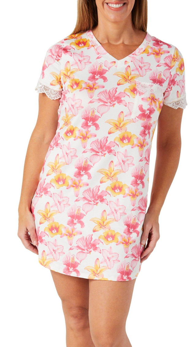 This women's floral night gown features a soft floral print and a flattering v-neckline for a relaxed and feminine look. A chest slip pocket adds a touch of charm and convenience, making it perfect for restful nights and cozy mornings. Fabrication 95% polyester, 5% spandex