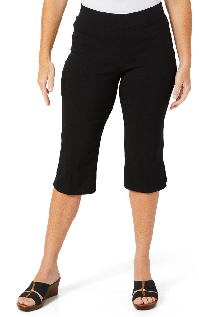 Step into easy style with these Pull On Capris, featuring a comfort waist and charming ladder hem detail. Perfect for everyday wear, they offer a flattering fit and breezy feel for warm weather days. Inseam measures approximately 21 in. Fabrication 76% rayon, 21% nylon, 3% spandex.