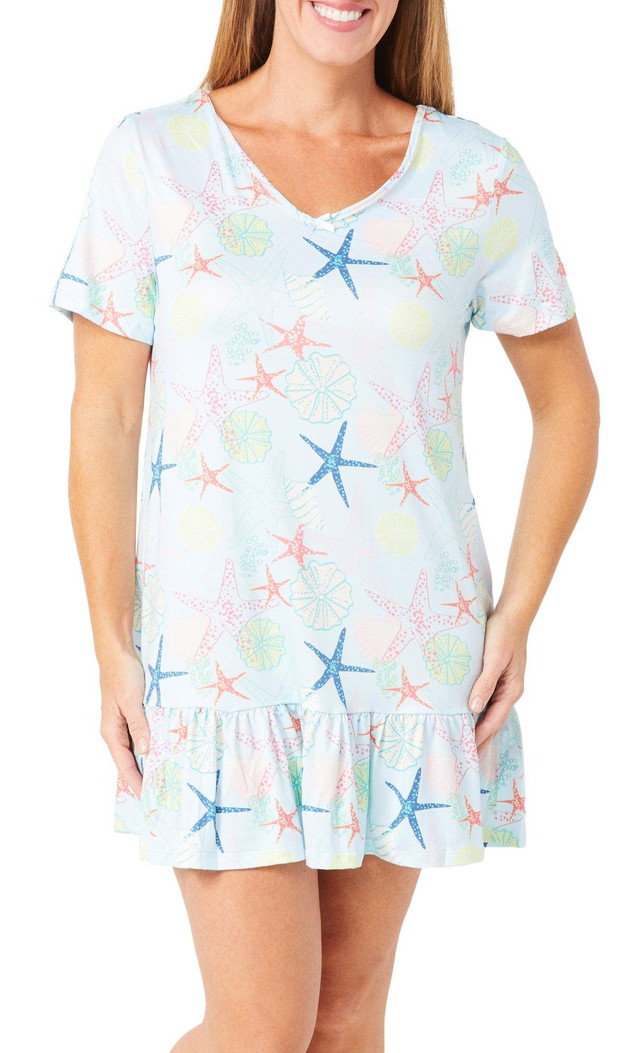 This women's nightgown offers a graceful silhouette with a soft flounce bottom and a flattering V-neckline. Light and comfortable, its designed for easy movement and relaxed evenings. Feminine and flowy, it brings a touch of elegance to your nighttime routine. Fabrication is 95% polyester and 5% spandex.