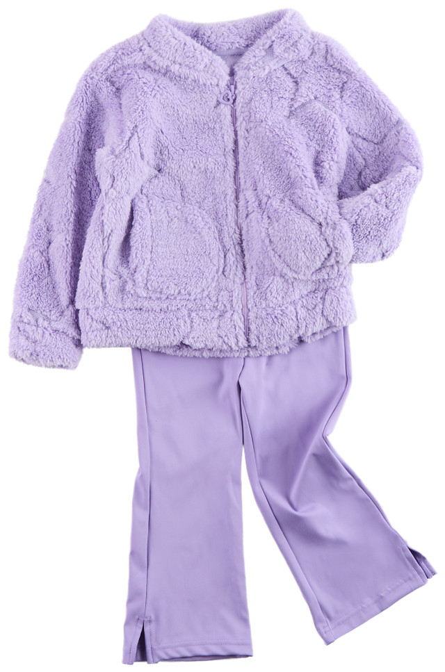 This toddler girls' 2-piece active set features a sherpa bomber jacket and solid pull-on flare pants. Designed for comfort and movement, it is a sweet and stylish choice for playtime or casual outings.