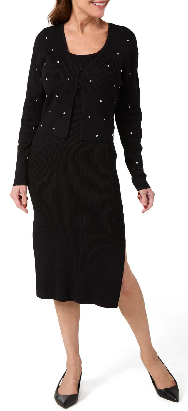 Elevate your look with this 2-piece dress set featuring a sleeveless, scoop neck maxi dress with ribbed texture and a coordinating cardigan adorned with rhinestone embellishments. Perfect for layering with style and sparkle. Fabrication 68% rayon, 32% polyester