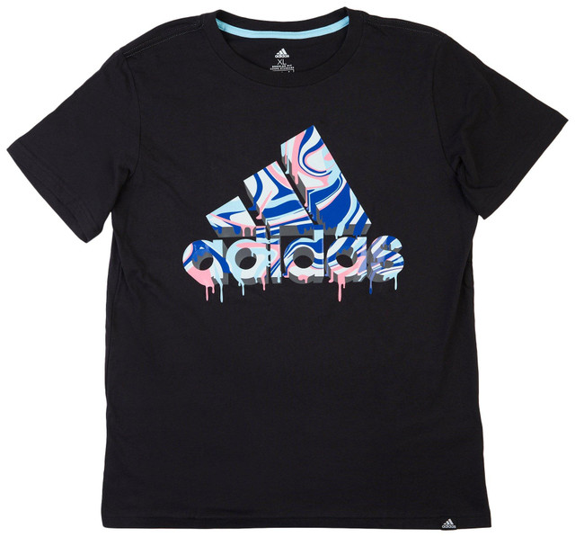 This black Adidas boys' shirt features a bold logo on the front with a dripping paint design for a trendy, artistic look. Designed with a crew neckline and short sleeves, it offers a classic fit and is made from 100% cotton for softness and breathability. Perfect for everyday wear, this stylish tee combines comfort and standout design, making it a great choice for active kids!
