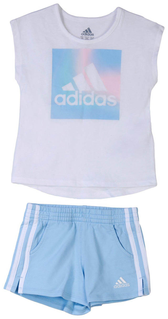 Keep her moving in comfort with this Toddler Girls Active 2 Pc T-Shirt Shorts Set, featuring a cotton/poly blend short sleeve shirt with a logo print on the front, paired with cotton shorts detailed with side stripes. Ideal for play, casual wear, and warm-weather activities.