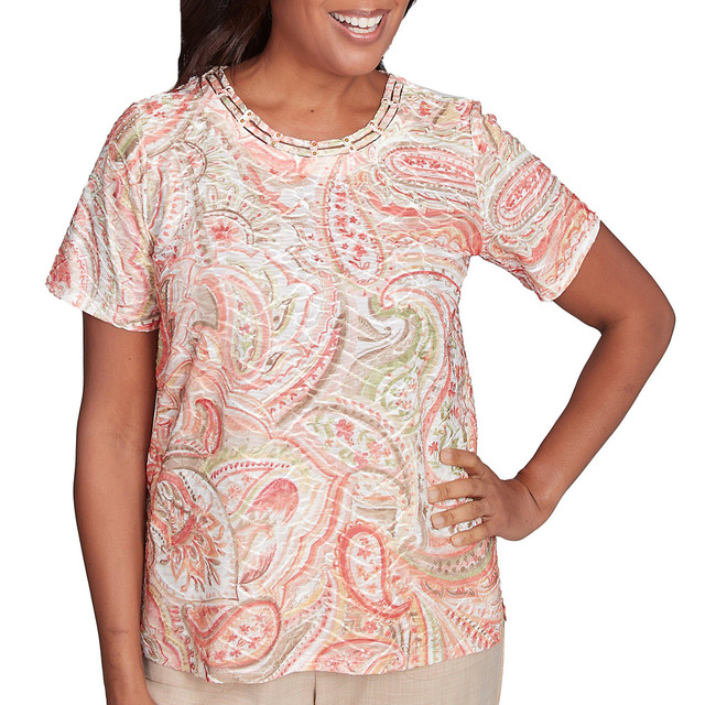 This eye-catching top features a vibrant paisley pattern and a unique double-knotted neckline. The short sleeves with intricate detailing add a touch of boho chic. The straight hemline provides a flattering fit, making it perfect for any occasion. Top length measures approximately 22.25 in. Fabrication is 98% Polyester, 2% Spandex.