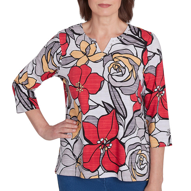 This 3/4 sleeves top features a print pattern on lightweight fabric, a split neckline, side split hemline, and classic fit. Length measures approximately 24 in. Fabrication is 95% cotton and 5% spandex.
