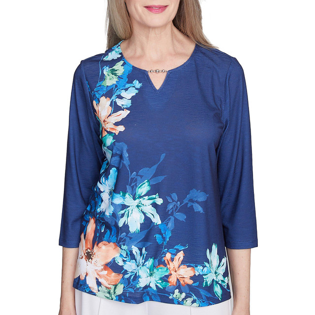 This top blends timeless style with creative flair, featuring a split beaded neckline that draws attention with subtle elegance. Three-quarter sleeves offer a classic touch, while the asymmetrical floral designs add an unexpected, artistic twist. Top length measures approximately 24.5 in. Fabrication is 95% Polyester, 5% Spandex.