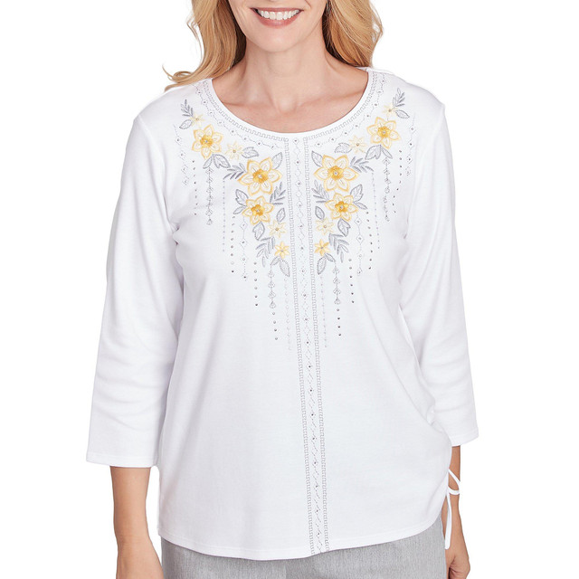 Alfred Dunner Womens 3/4 Sleeve Floral Embroidered Top