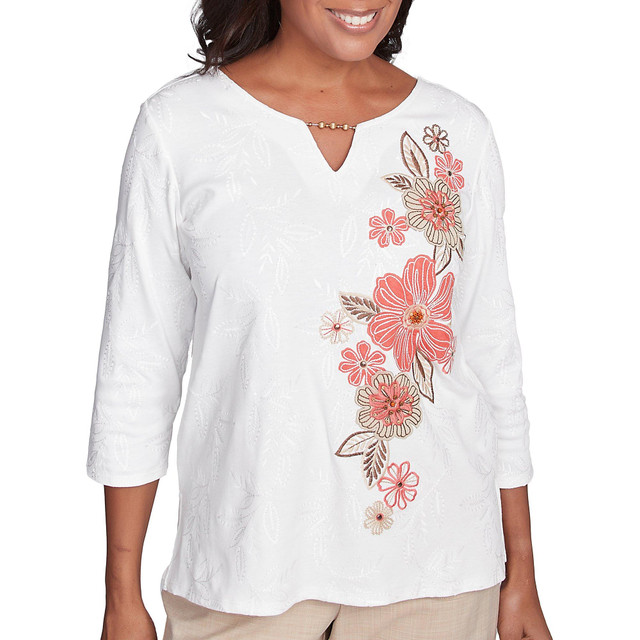 Alfred Dunner Womens 3/4 Sleeve Romantic Embroidered Top