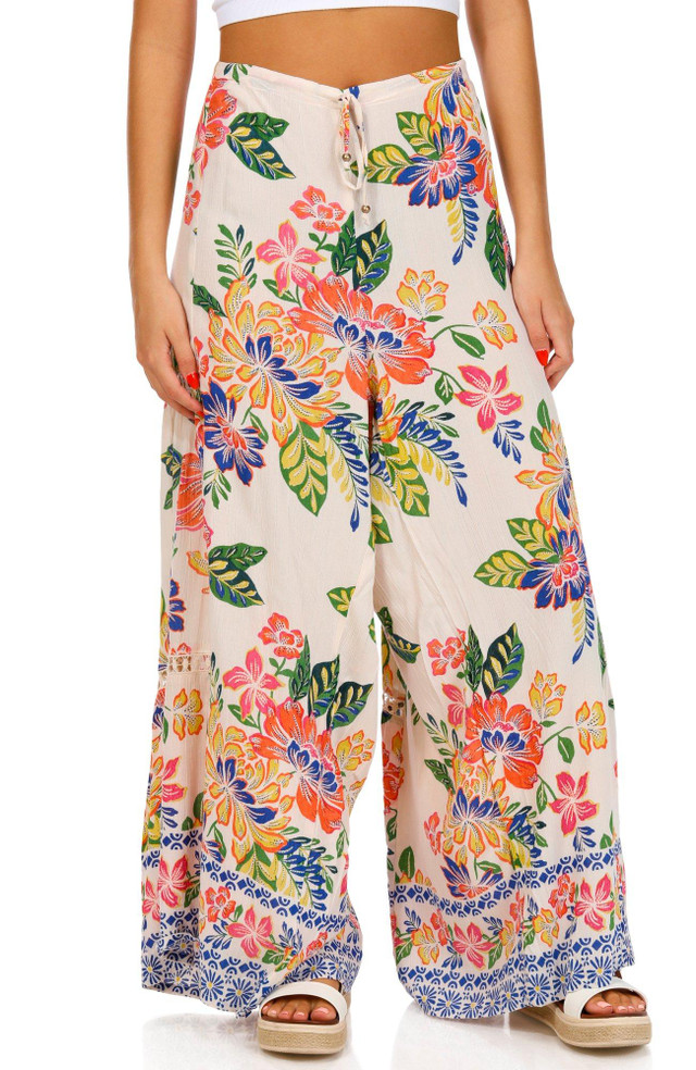 Introducing the Juniors Floral Pants with Crochet Detail from Angie, crafted from rayon for a lightweight and comfortable feel. These stylish pants feature a vibrant floral print, tiered crochet details, a smocked pull-on waistband with a tie, and side pockets for easy wear. The flowy fit adds a touch of elegance, making them perfect for any casual or dressy occasion.