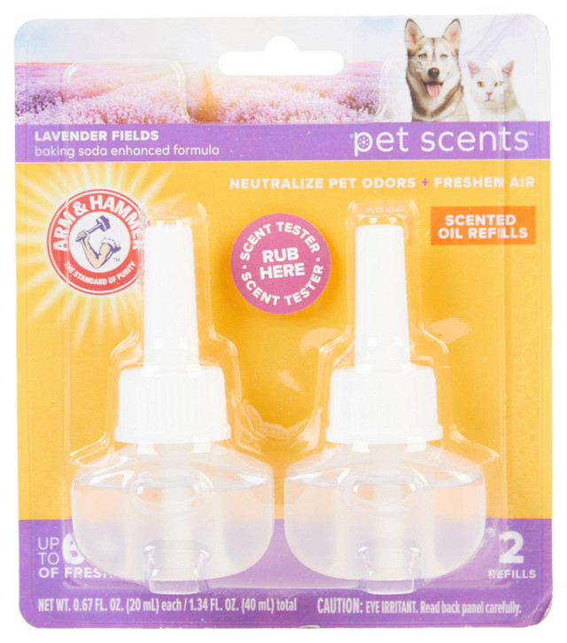 Refresh home environments with the 2 Pk Pet Scents Plugin Scented Oil Refills in Lavender Fields featuring a baking soda enhanced formula to help neutralize pet odors and freshen the air. Designed for use with compatible oil warmers to maintain a clean and calming atmosphere. For use in well ventilated areas.
