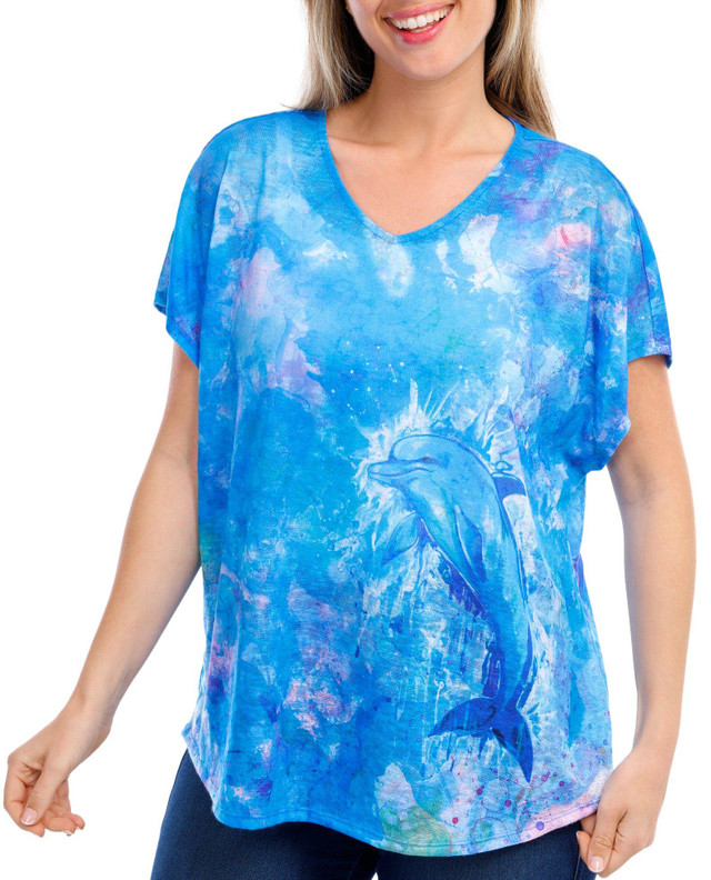 This women's dolphin dolman short sleeve top with a V-neckline offers a relaxed and flattering fit with its flowy silhouette and unique dolphin hem. Made from soft, breathable fabric, it's perfect for casual outings or weekends. Pair it with jeans or skirts for a chic, effortless look. The top length measures approximately 27 in. Fabrication 100% polyester.