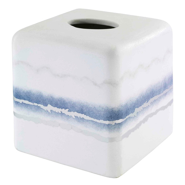Refresh your bathroom with the Avanti Murano Tissue Cover. It features a marble look with a matte white base and irregular horizontal bands of light grey, dark grey and silver. No two pieces are the same. Made of durable resin. Measures 5.88 in. x 5.88 in. x 5.88 in.