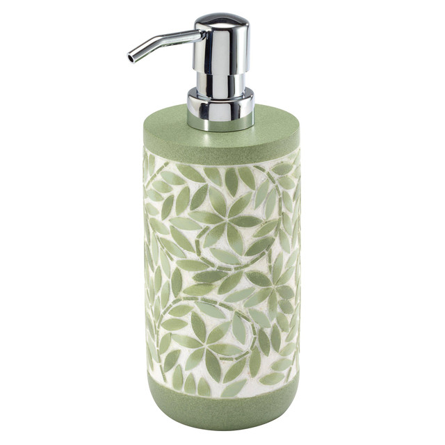 The Avanti Stratford Soap Dispenser/Lotion Pump features a raised leaf and vine design in various shades of sage green with a matching top border and base. Finished with shiny silver pump. Made of durable, hand-painted resin for easy care and long life. Hand painted. Measures 2.99 in. x 2.99 in. x 8.07 in.
