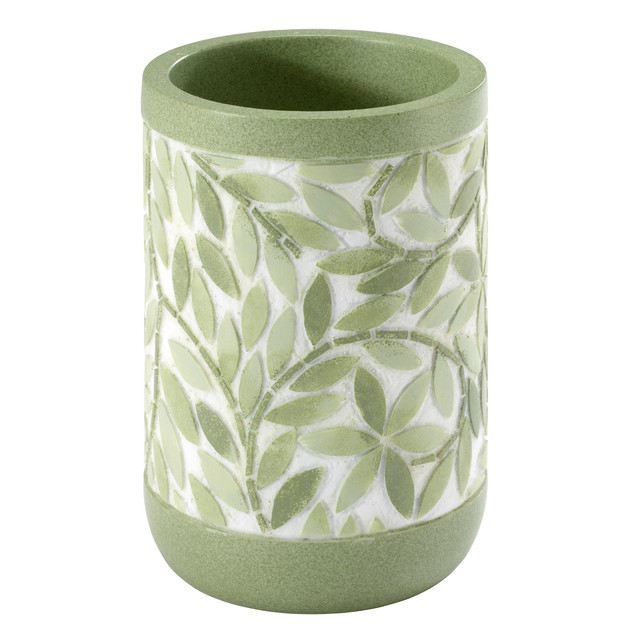 The Avanti Stratford Green Tumbler features a raised leaf and vine design in various shades of sage green with a matching top border and base. Made of durable, hand-painted resin for easy care and long life. Hand painted. Measures 2.95 in. x 2.95 in. x 4.33 in.