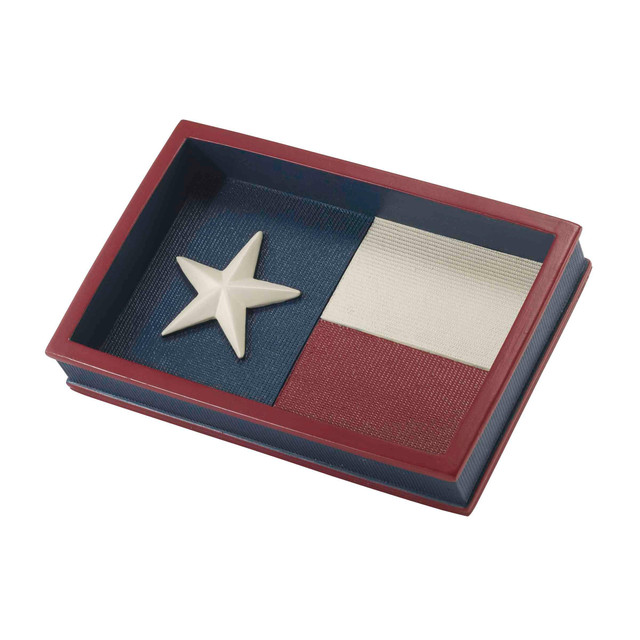 The Avanti Texas Flag Decorative Soap Dish features the Texas Flag on the inside, with a cream star on a blue field on the left and red and cream stripes on the right. The inside and outside walls are solid blue and finished with a red border top and bottom. Made of durable, hand-painted resin. Measures 3.50 in. x 2.25 in. x .80 in.