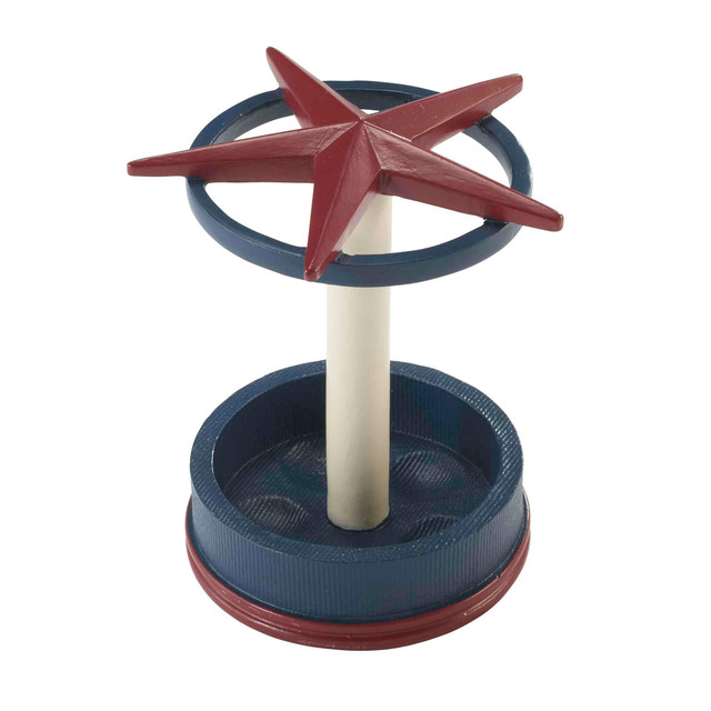 The Avanti Texas Flag Decorative Toothbrush Holder features a red star on a blue circle held up by a cream column. The bottom is blue with textured and finished with a double red border. Holds five toothbrushes. Made of durable, hand-painted resin. Measures 4.13 in. x 4.13 in. x 4.63 in.