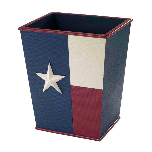 The Avanti Texas Flag Decorative Wastebasket features the Texas Flag on the front, with a cream star on a blue field on the left and red and cream stripes on the right. The sides and back are solid blue with a red border top and bottom. Made of durable, hand-painted resin. Measures 8.27 in. x 6.50 in. x 10.0 in.