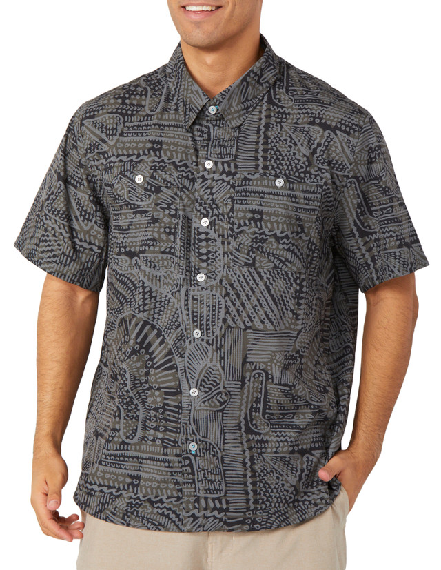 This mens short sleeve button down provides sun protection and moisture wicking comfort, featuring two chest pockets and a vibrant printed pattern. Perfect for outdoor adventures or casual days, this shirt combines style and practicality. Shirt length measures approximately 29.5 in. Fabrication is 92% polyester and 8% spandex.