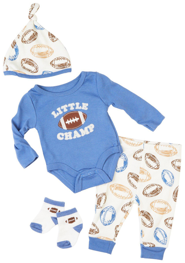 Gear him up for game day with this baby boys 4-piece football pant set. Includes a soft bodysuit with easy snap closure, matching pants, a cozy hat, and socks to complete the look. The bodysuit, pants, and hat are made from a comfortable blend of 60% cotton and 40% polyester. Socks are crafted from 67% cotton, 31% polyester, and 2% spandex for a snug fit. Machine wash and tumble dry for easy care. Perfect for everyday wear or sporty outings.
