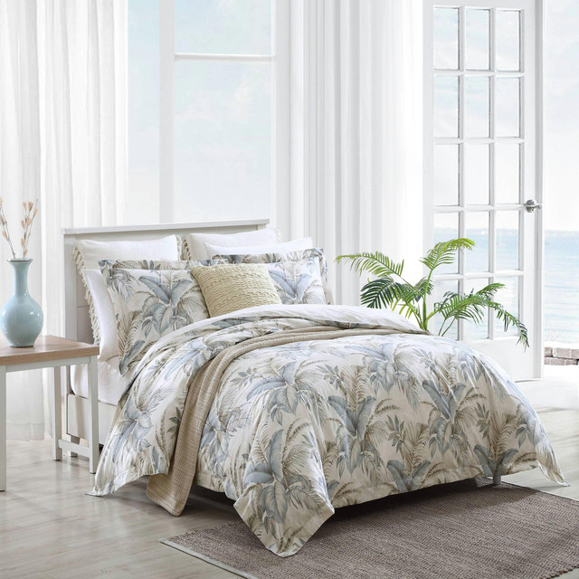 Make your bedroom an island oasis with this tropical inspired duvet cover set by Tommy Bahama. A sophisticated palette of silver blue and neutrals adds the perfect amount of color to this calming set straight out of paradise. Made of high-quality cotton, the duvet cover features a button closure and additional inner ties to keep your insert in place. The set includes 1 duvet and 2 shams. Machine washable for easy care.