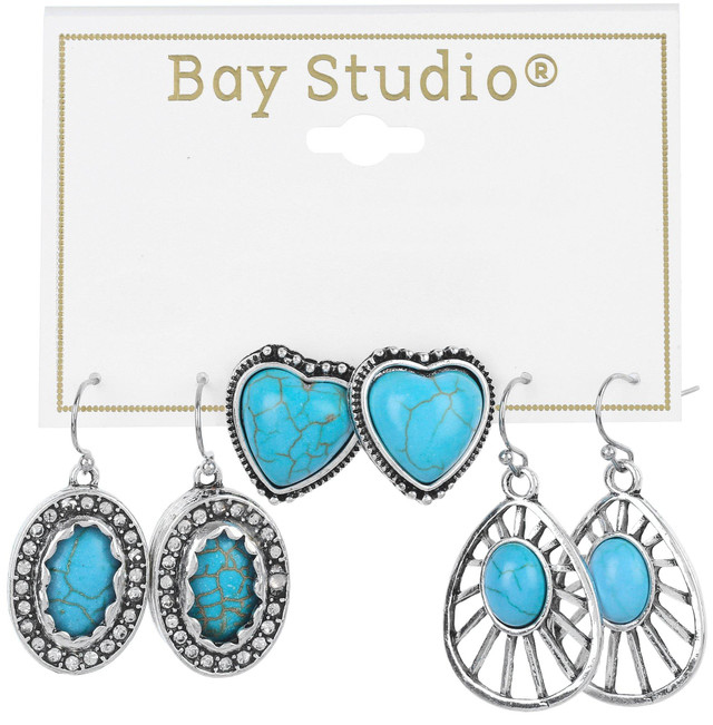 The Bay Studio 3 Pack Textured Turquoise Earrings offers a versatile set of three pairs of earrings, each featuring a unique textured design paired with beautiful turquoise accents. The earrings include a variety of styles, such as studs, hoops, or drops, allowing for different looks and occasions. The textured metal details add dimension and interest, while the turquoise stones bring a pop of color.
