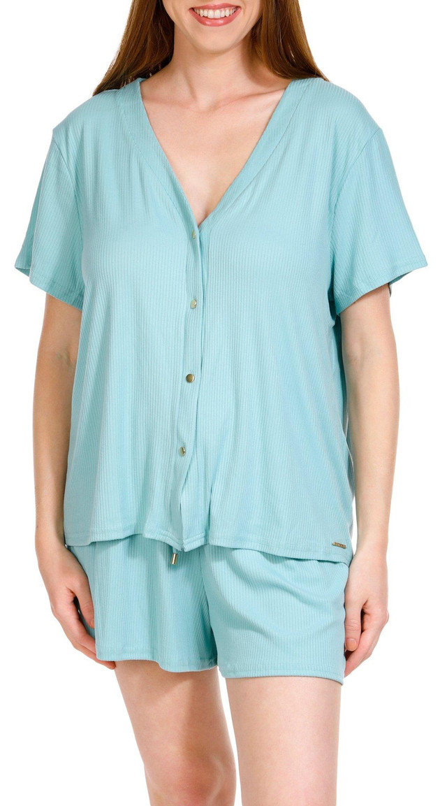 Introducing this 2-Piece Sleepwear Set, a perfect blend of comfort and style. This set features a cozy ribbed fabric and includes a short sleeve buttoned top paired with drawstring shorts. Ideal for a restful night's sleep or lounging around the house, this sleepwear set offers a relaxed fit and a chic design. Fabrication is 95% polyester, 5% spandex.
