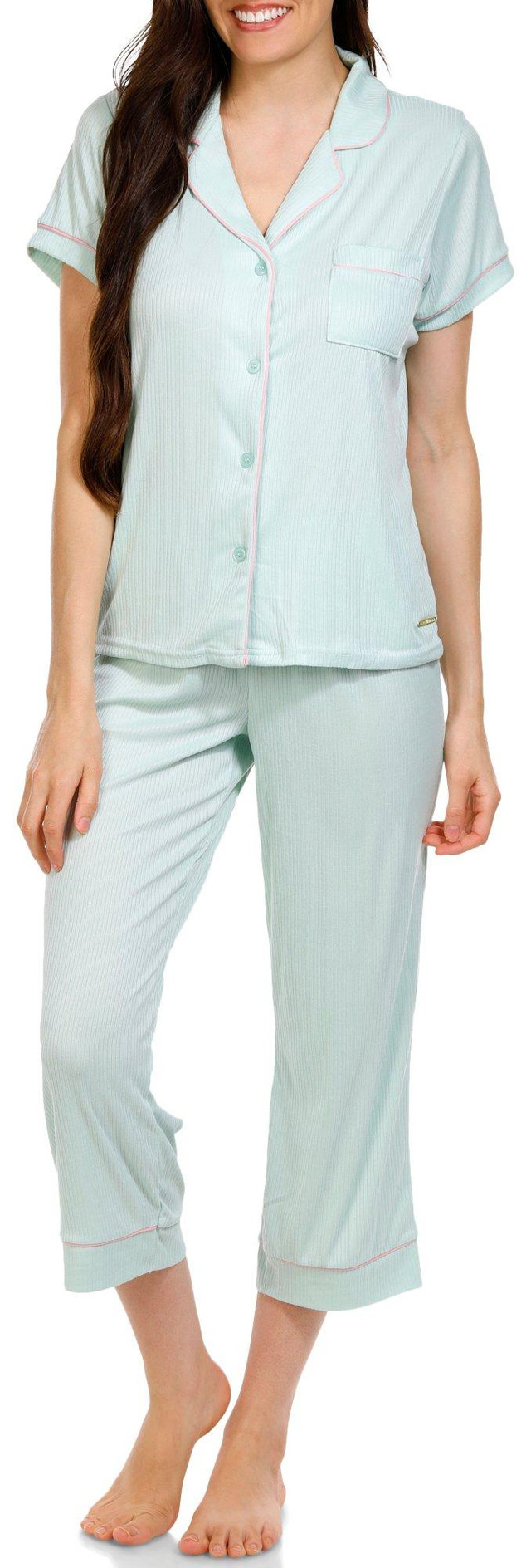 Introducing this 2-piece Sleepwear Set, a cozy and stylish addition to your nighttime routine. This set features soft ribbed fabric that provides ultimate comfort. It includes relaxed pants and a short sleeve buttoned shirt with a convenient chest pocket. Fabrication is 95% polyester, 5% spandex.