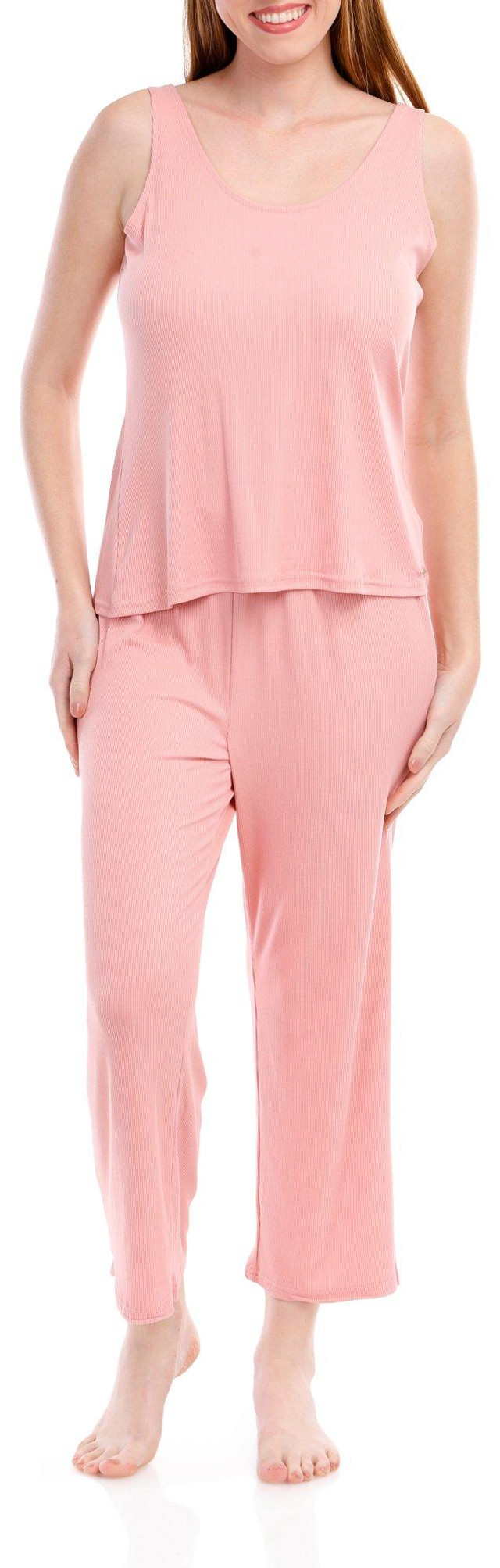 Indulge in cozy comfort with this 2-piece Sleepwear Set, featuring a sleeveless top and matching pants. Crafted from soft, ribbed fabric, this set offers a snug and comfortable fit, perfect for a restful night's sleep. The sleeveless top provides ease of movement, while the matching pants ensure full coverage and warmth. Fabrication is 95% polyester, 5% spandex.