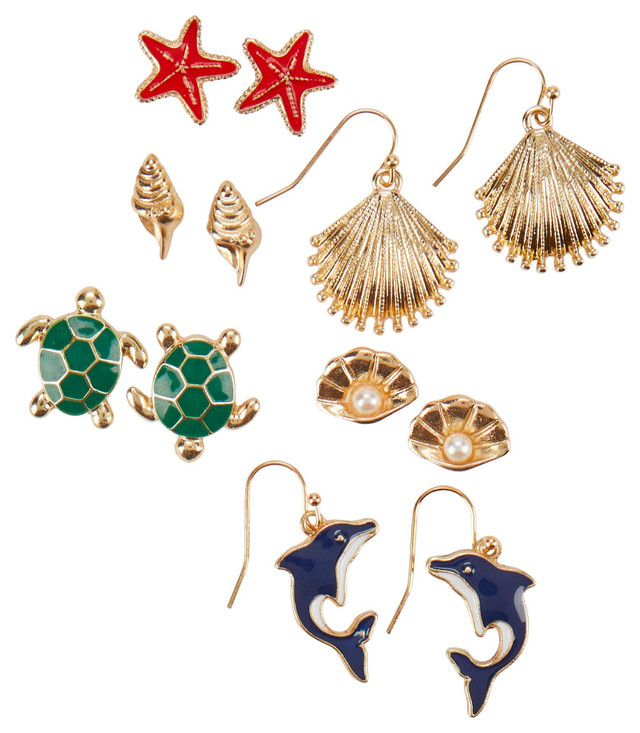 Bring the ocean to your ears with the Beach Chic 6-Pack Stud/Drop Sea Life Earrings. This set features a variety of fun, sea-inspired designs, perfect for adding a touch of coastal charm to your look. Ideal for mixing and matching for a playful, beachy vibe.