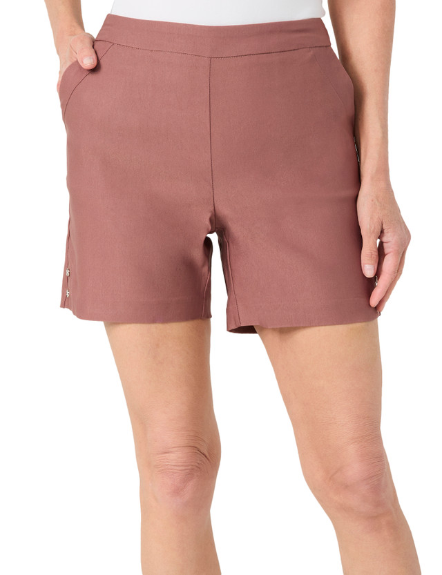 These petite double pocket stud shorts feature a clean solid color with an easy pull on waistband. Side pockets and a faux back pocket add detail, while stud grommets along the hem bring a subtle edge. The comfortable fit makes them perfect for everyday wear. Inseam measures approxmiately 5 inches. Fabrication 77% rayon, 20% nylon, 3% spandex