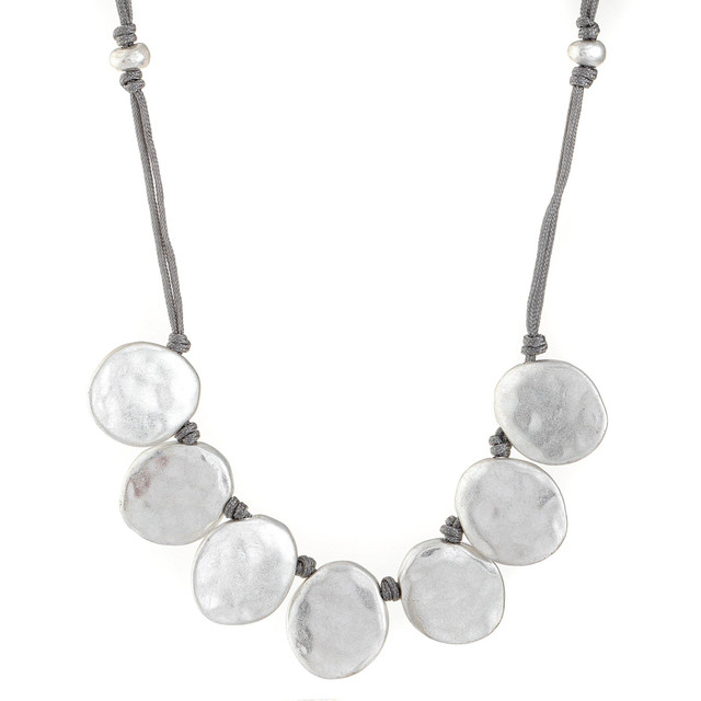 Make a bold yet effortless statement with this silver-tone disc necklace. Featuring hammered metal accents on a dark cord, it brings a modern artisan vibe to any casual or elevated look.