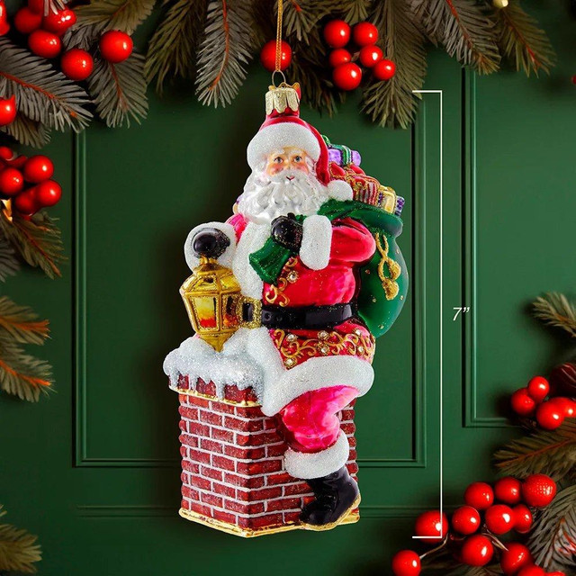 Celebrate the season with the 7-Inch Bellisimo Santa In Chimney Ornament. Santa shines in a glittered red and white suit with gold scrolls and sparkling gemstones. Holding a gold lantern and a festive gift sack, he brings classic holiday charm to your Christmas tree or décor. A perfect collectible for elegant seasonal decorating. Measures 3 in. x 3 in. x 7 in. Part of Kurt Adler's Bellissimo Glass Collection.