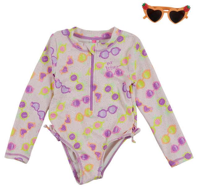 This one-piece swimsuit with a long-sleeve rash guard offers stylish protection and comfort. Featuring a playful sunglasses pattern, it adds a fun and trendy touch to swimwear. Made from 100% polyester, it is wrinkle-resistant and breathable, ensuring a lightweight feel for all-day wear. Perfect for active swim days, this suit combines fashion with functionality for a sleek and comfortable fit. Includes sunglasses