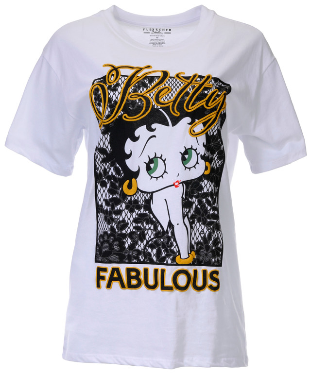 Make a statement with the Juniors Fab Betty Screenprint Tee T-shirt featuring a bold front graphic of Betty Boop with floral lace detailing and Fabulous text. Designed with a crew neckline and short sleeves for classic comfort with iconic flair. Fabrication is 60% cotton 40% polyester. Length measures approximately 28 in.
