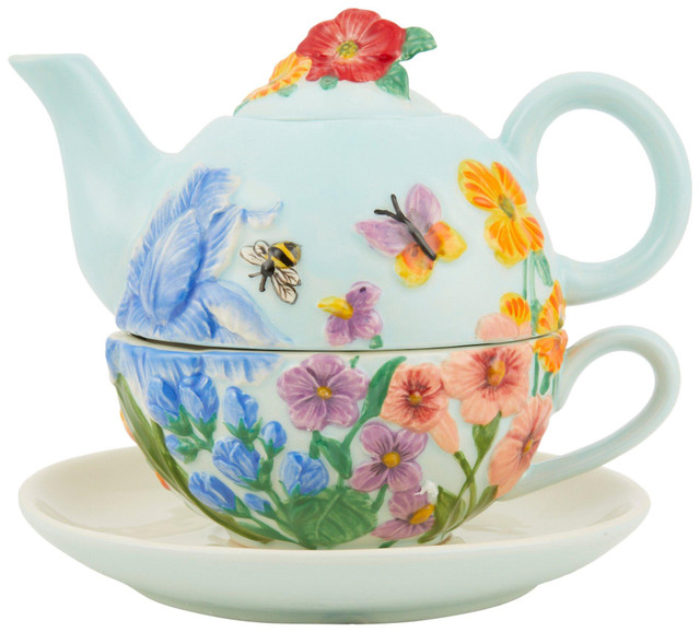 Delight in a quiet tea moment with the Wildflower Tea for One Teapot Set. Featuring a petite ceramic teapot that nests neatly atop a matching cup and saucer, the set showcases charming blooms, butterflies and bees in soft, cheerful colors. Perfect for cozy mornings or gifting to a tea lover, it brings garden-inspired elegance to every sip. Measures approximately 6.5 in x 8.5 in x 7 in.
