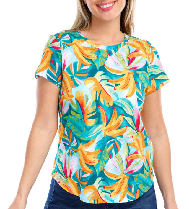 Introducing the Luxey Short Sleeve T-Shirt, where elegance meets comfort. This chic tee features a vibrant print that adds a touch of tropical beauty to your wardrobe. The round neckline offers a classic look, while the soft, breathable fabric ensures all-day comfort. Fabrication is 60% cotton and 40% modal.