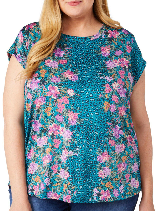 Elevate your everyday style with this stylish cap sleeve top. Crafted from a stretchy fabric blend, this top offers both comfort and flexibility. The round neckline adds a classic touch, making it perfect for pairing with jeans or skirts. Whether youre dressing up for a special occasion or keeping it casual, this floral animal print top is a versatile addition to your wardrobe. Fabrication is 96% polyester, 4% spandex.