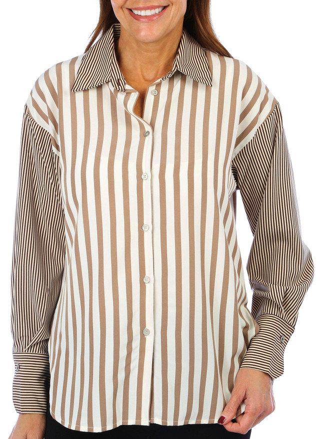 Add a touch of elegance to your wardrobe with our Striped Long Sleeve Top. This charming piece features a full buttoned front and mixed striped print, creating a playful and sophisticated look. The buttoned cuffs ensure a comfortable fit. Perfect for both casual and dressy occasions, this top combines style and comfort effortlessly. Fabrication is 97% polyester and 3% spandex.