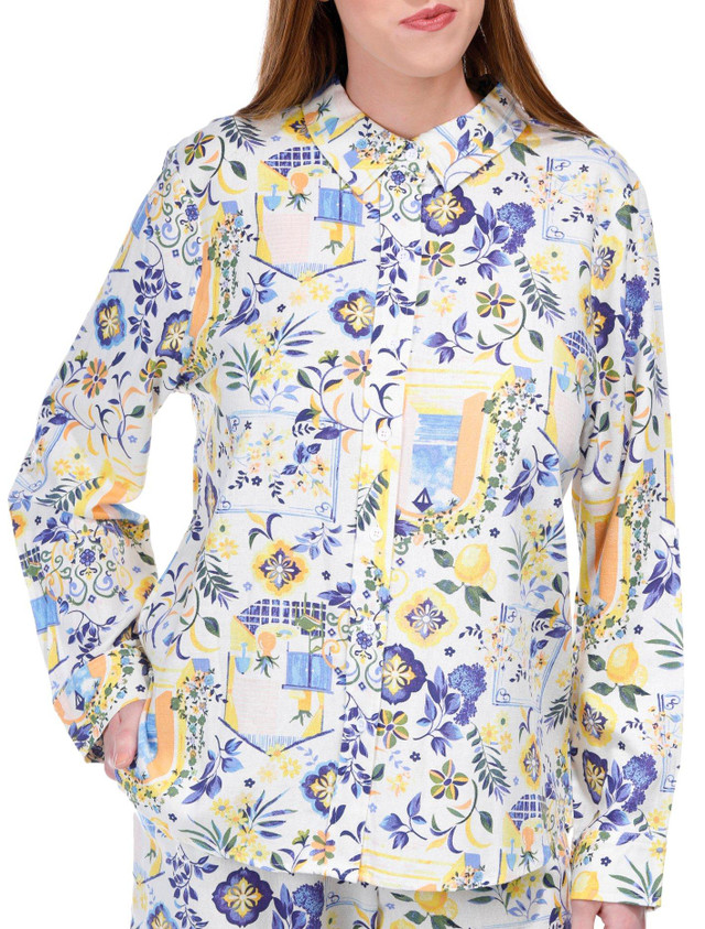 This print button-down top brings bold patterns and effortless style together. Crafted from lightweight fabric, it features a tailored fit and classic button-down design, making it a versatile piece for both casual and semi-formal occasions. Perfect for pairing with jeans or skirts for a chic look. The top length measures approximately 28 in. Fabrication is 80% Rayon, 20% Linen.