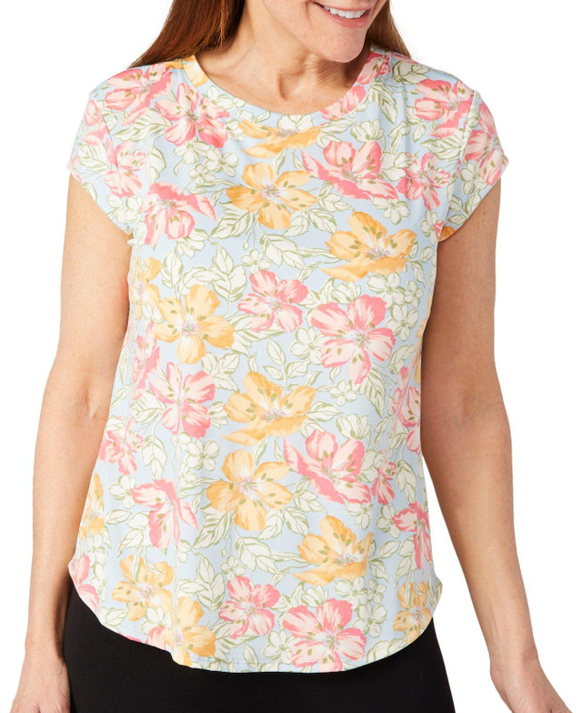 Embrace a touch of elegance with the Floating Flower Cap Sleeve Top. Featuring a charming floral print and a flattering scoop neck, this top is perfect for adding a feminine touch to any outfit. The cap sleeves provide a delicate, airy feel, making it ideal for warm weather. Fabrication is 96% polyester, 4% spandex.