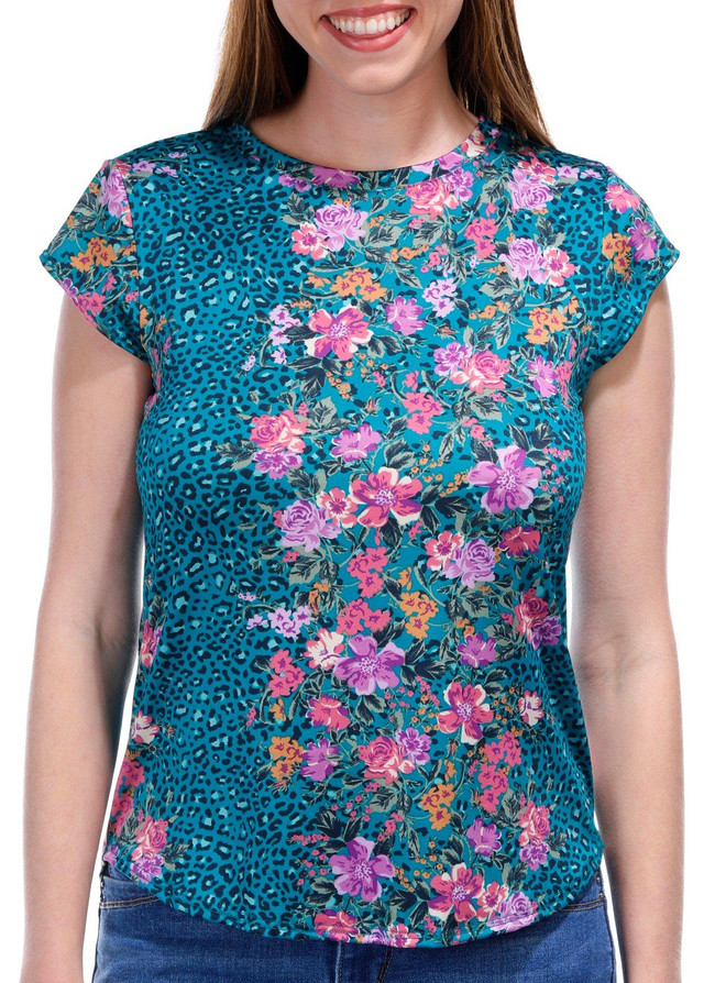 Elevate your everyday style with this stylish cap sleeve top. Crafted from a stretchy fabric blend, this top offers both comfort and flexibility. The round neckline adds a classic touch, making it perfect for pairing with jeans or skirts. Whether youre dressing up for a special occasion or keeping it casual, this floral animal print top is a versatile addition to your wardrobe. Fabrication is 96% polyester, 4% spandex.