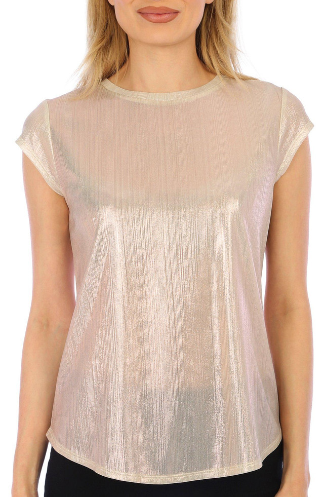 Introducing the Women's Metallic Cap Sleeve Top, crafted from a blend of polyester and spandex for a comfortable fit. This top features a stylish metallic exterior, short cap sleeves, and a classic crew neckline. Perfect for adding a touch of shimmer to any outfit, it's ideal for both casual and festive occasions. Elevate your wardrobe with this chic and versatile piece!