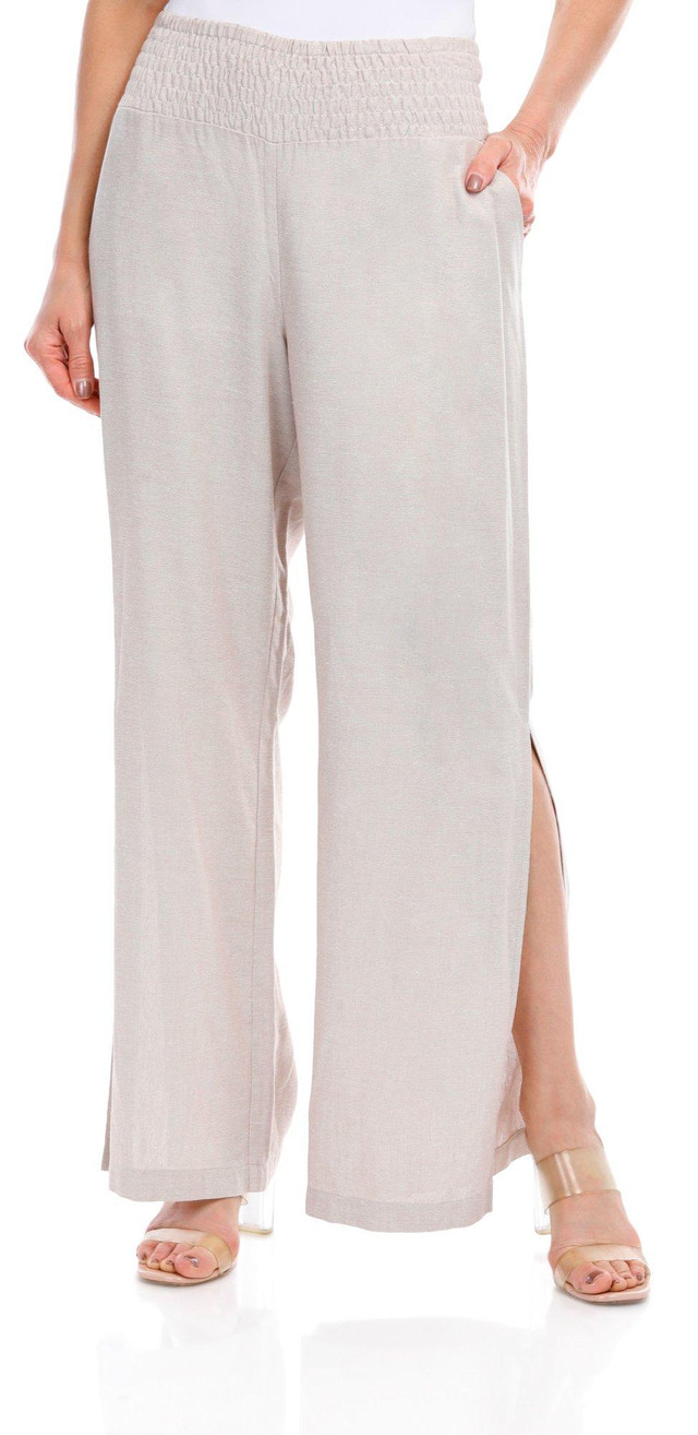 Elevate your casual wardrobe with these Woven Linen Pull On Pants. Featuring a comfortable smocked waistband, they offer a relaxed yet stylish fit. The double side pockets add practicality, while the side splits provide a touch of flair and ease of movement. Inseam measures approximately 30 in. Fabrication is 80% rayon, 20% linen.