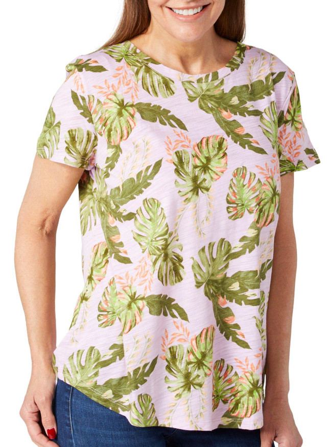 Embrace the essence of summer with the Baja Tropical Short Sleeve Luxey Tee. Featuring a flattering scoop neckline and a vibrant tropical print, this tee is perfect for warm weather and sunny days. Made from soft, breathable fabric, it ensures all-day comfort and ease. Whether you're heading to the beach or a casual outing, this tee adds a touch of tropical flair to your wardrobe. Top length measures approximately 26 in. Fabrication is 60% cotton and 40% modal.