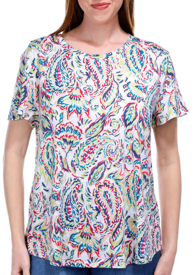 Embrace the essence of summer with the Swirl Paisley Short Sleeve Luxey Tee. Featuring a flattering scoop neckline and a vibrant print, this tee is perfect for warm weather and sunny days. Made from soft, breathable fabric, it ensures all-day comfort and ease. Whether you're heading to the beach or a casual outing, this tee adds a touch of tropical flair to your wardrobe. Top length measures approximately 26 in. Fabrication is 60% cotton and 40% modal.