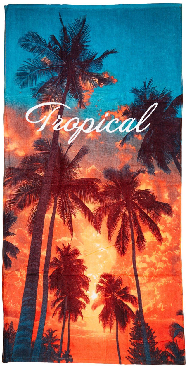 This beach towel features tropical palm tree silhouettes set against a serene sunset sky, perfect for relaxing seaside escapes or lounging by the pool. Fabrication is 100% cotton. Measures 36 in x 72 in.