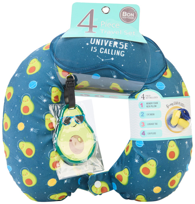 Travel in comfort and style with the 4 piece travel pillow set. Includes a charming avocado print travel pillow, matching eye mask, memory foam ear plugs, and luggage tag for easy packing. Designed to keep essentials organized while adding a touch of fun to any journey.