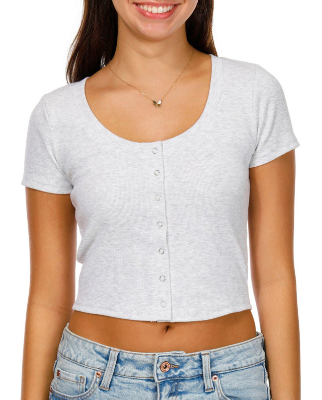 Keep it casual and cute with this Juniors Short Sleeve Ribbed Snap Button Top, featuring a solid color, snap-front detail, and a trendy cropped length. Perfect for pairing with high-rise jeans or skirts. Fabrication 57% cotton, 38% polyester, 5% spandex